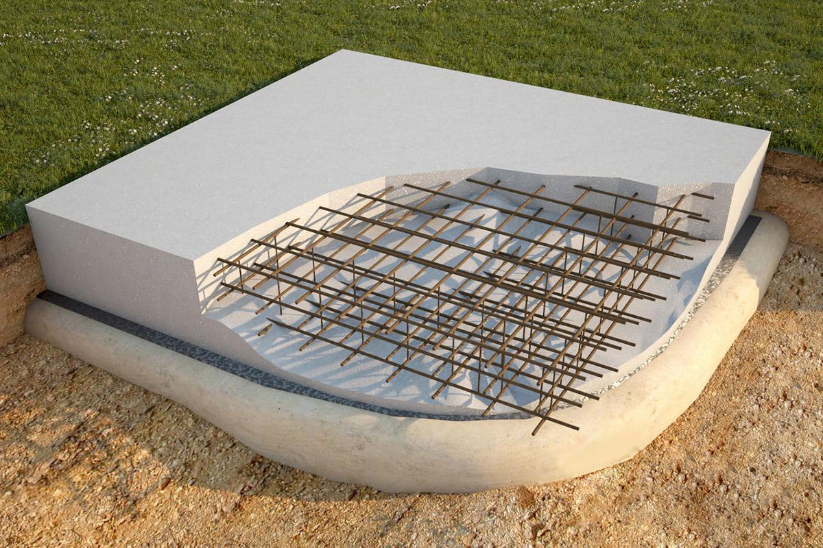 - Плитный. Этот вид является монолитной железобетонной плитой, расположенной под всей площадью будущей конструкции. Плитный фундамент подходит для всех типов грунта, а также выдерживает различные смещения почвы. Однако данный фундамент является затратным, обладает большим расходом строительного материала.