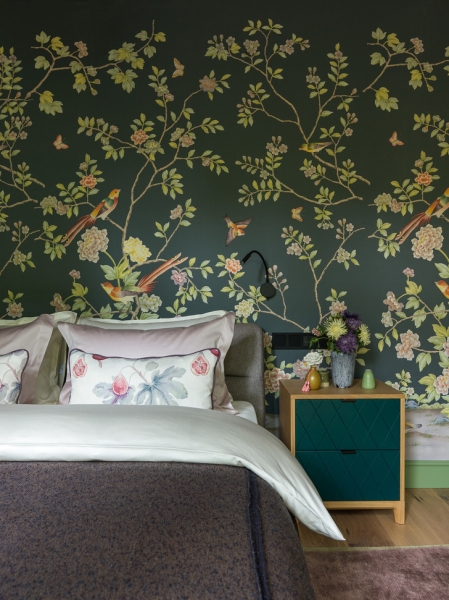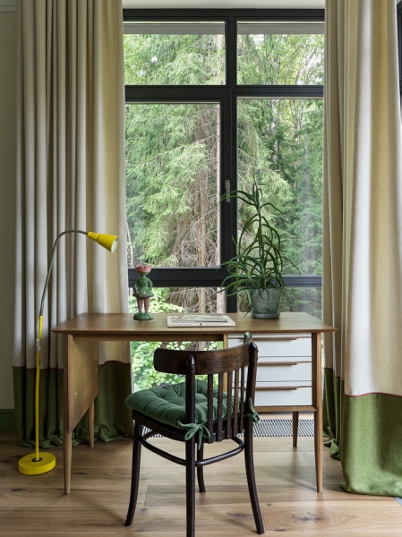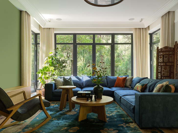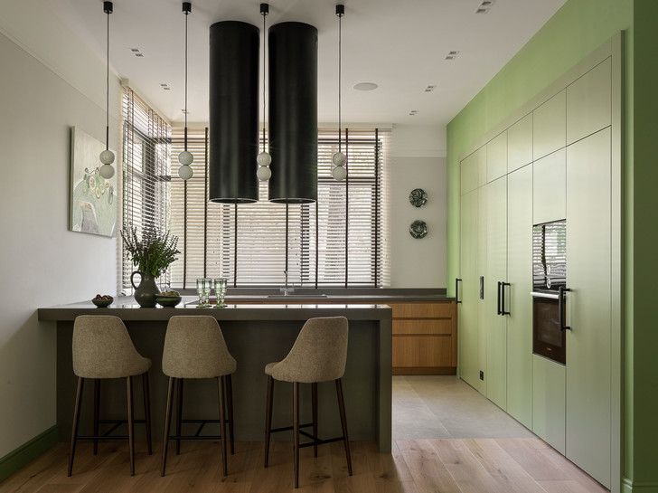 «Стены в кухне-гостиной мы выкрасили в зеленый — это один из двух любимых цветов заказчицы. Мы долго искали нужный оттенок. В итоге остановились на теплом тоне, который хорошо сочетается и с видом из окна, и с мебелью других цветов».