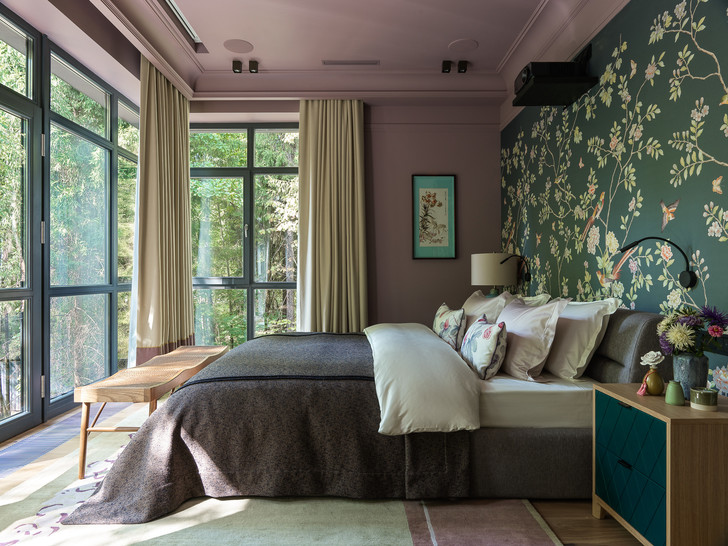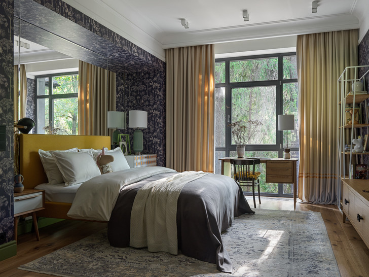 Главная спальня. Скамья, Zara Home. Кровать, Estetica. Ковер, «Декораторское ателье Марка Патлиса». Декоративное панно, «Красиво как раньше».