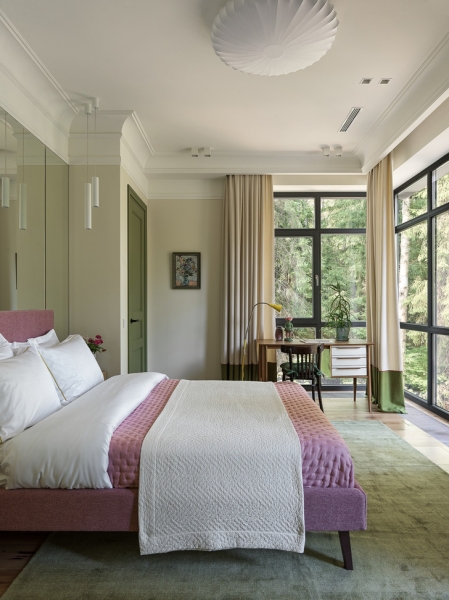 «Дом окружен лесом, поэтому в процессе проектирования мы специально рассчитывали инсоляцию. Но одна детская оказалась темнее, чем должна была быть из-за плотных крон. исправить ситуацию помогло зеркальное панно, которым мы отделали стену за изголовьем кровати. В нем отражаются деревья, и таким образом мы не только сделали пространство светлее, но и привнесли в интерьер природу. Вторую детскую мы тоже украсили зеркалами — младшая дочь заказчиков взяла пример со старшей и захотела похожую обстановку у себя в комнате».