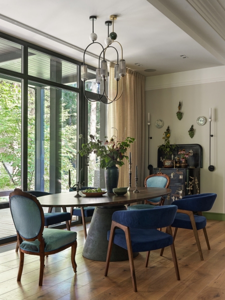 «Несмотря на то, что архитектура дома и большая часть предметов интерьера выполнены в современном стиле, нам хотелось создать уютную дачную атмосферу. Поэтому мы добавили мебель с классическими элементами и антиквариат. например, в столовой зоне разместились расписанные в стиле шинуазри комод и шкаф. В последнем теперь находится бар. В гостиной дачную атмосферу поддерживают детали в рустикальном стиле: деревянная резная ширма и антикварные доски для пряников, которые подобрала Даша Соболева и повесила на стену как декоративный элемент».